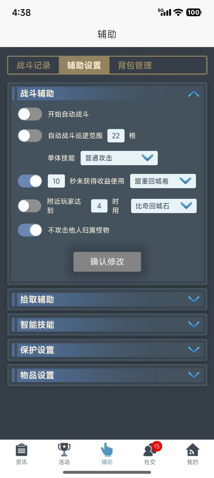 【辅助设置】 辅助设置页包括:战斗辅助、拾取辅助、智能技能、保护设置和物品设置。调整后可即时同步至客户端的角色设置。