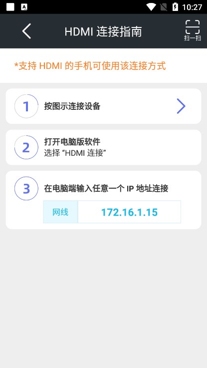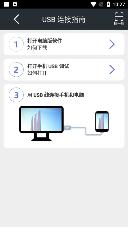 2、首次通过USB数据线连接以后,如果感觉数据线比较繁琐,我们点需要拔掉数据线断开与电脑的连接,然后可以通过WIFI进行连接。WIFI连接有两种方式:一种是通过输入IP地址和连接密码进行连接,还有一种是通过扫一扫二维码快速连接。