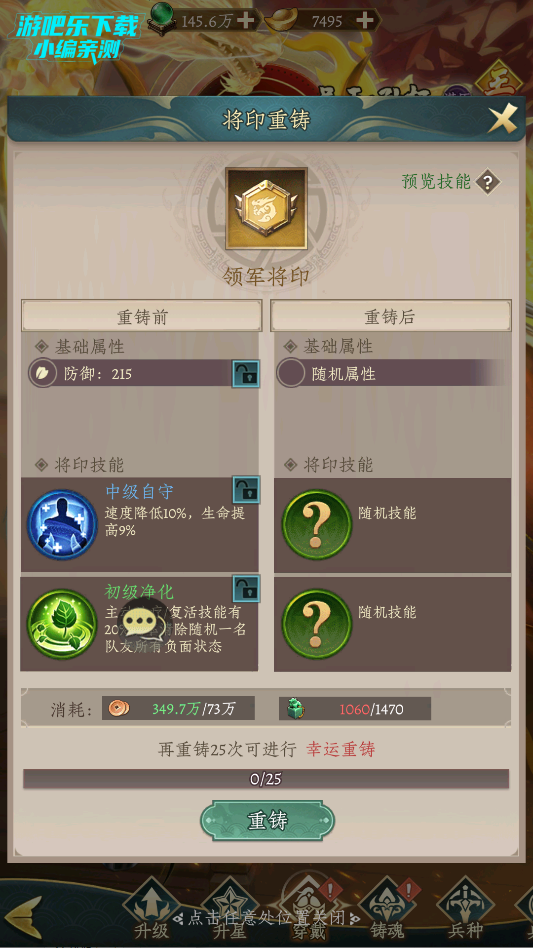 2.每次重铸都将消耗将印石和铜钱,将印品质越高,消耗的将印石越多。