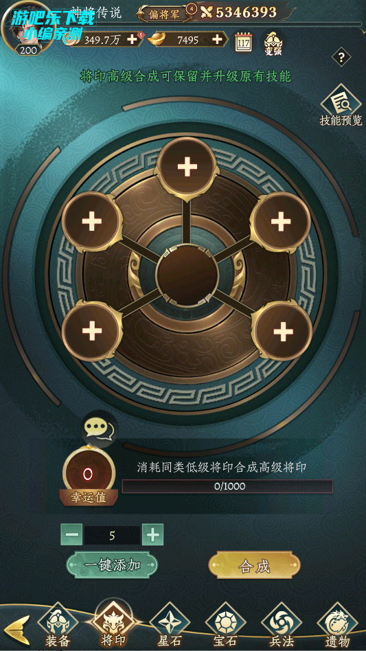 技巧:五枚同品质将印合成,锁定石锁核心技能