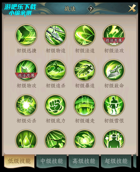 3.战法技能分为5个等级,分别为初级、中级、高级、超级、究极,具体战法技能说明可在武将-武将详情-战法-战法预览中查看(需武将6星以上,解锁战法栏)。