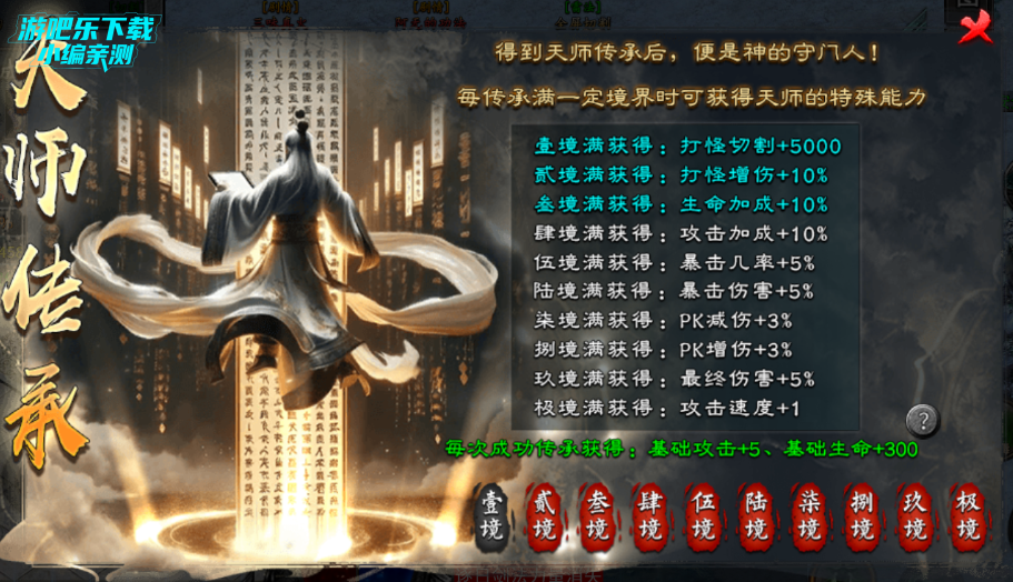 三大陆开始可以接受天师传承,每次成功传承可获得基础属性,传承达到一定境界可以获得高额百分比属性加成,传承境界满级还可以获得稀有称号。