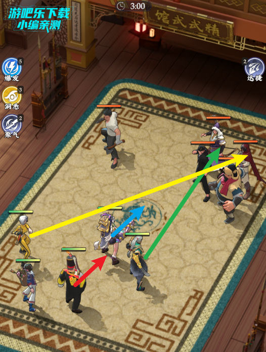 整个英雄站位是李三、虞丹伶和李玲珑在前排,张潮和兰姝在最后一排。这里可以重点说一下,虞丹伶和李三在站位上要靠近些,不要分太开,他们之间可以互相打配合。
