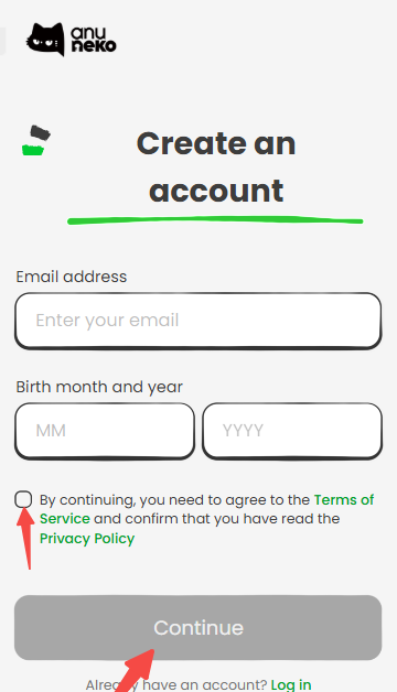 2、然后输入电子邮箱以及出生年月,然后打钩,点击底部Continue按钮。