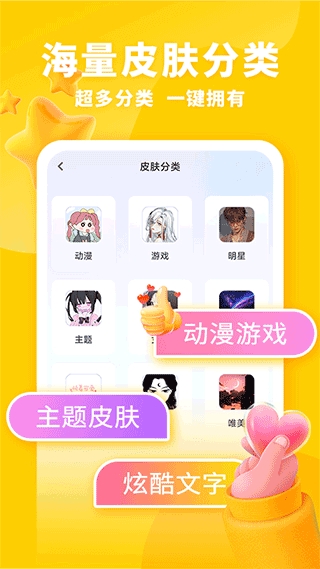 4、点击皮肤分类,有动漫、游戏、明星、主题、女生、星空、炫酷、唯美、文字等多种类型的皮肤;