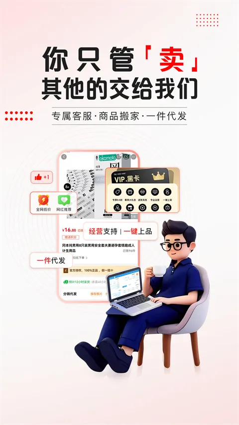 4. 极速供应链:合作100厂家,24小时内发货,晚发必赔。还有专属大客户经理1对1选品指导,降低选品试错成本。