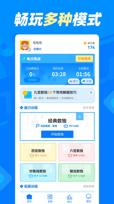 1. 包含多种模式数独,除经典九宫格外,还有四宫、六宫、八宫及多种难度升级变体。