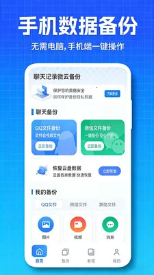 1、支持多平台备份,能将QQ微信等平台消息、图片、视频及文件快速备份至本地或云端。