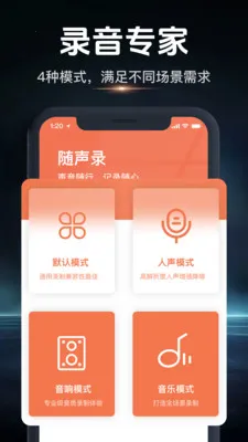 1、提供多种录音模式,默认模式保障通用录制兼容性,人声模式增强人声并降环境噪音。