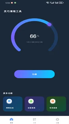 灵巧清理工具是多功能实用工具,首页半圆仪表盘展示存储占用,可一键扫描清理垃圾,还能查看设备信息与监测电池状态。工具页有2048小游戏等多种精选功能,兼顾趣味与效率。