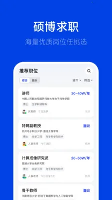 理聘是专注硕博招聘求职的平台,有海量优质职位,众多知名单位发布。基于智能推荐精准匹配,可在线直聊获反馈。最新版全面接入AI,重构搜索页面,还有简历诊断、智能投递等功能,求职更轻松。