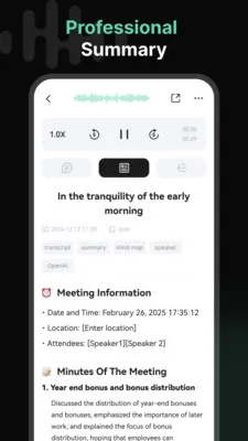 悦会2026最新版本是一款强大的应用。它能随时随地无缝录制高清音频,无论是会议、课堂等场景都能完美应对。借助先进技术可实现准确的实时语音转文字,清晰标注说话人身份并附带时间戳。还能自动提取录音关键要点、待办事项和核心见解,节省时间。此外,能将内容转化为交互式思维导图,帮助整理思路激发创意。