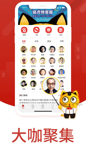 2. 热门大咖云集:支持关注热门大咖,实时获取大咖赛事分析,助力了解赛事走向。而且明星大咖齐上阵,通过被点亮的头像可快速识别热门专家与解说。