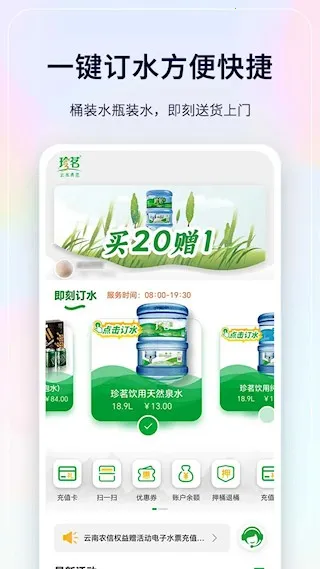 2. 功能丰富。提供订水、订票、订购水机等入口,满足您多样化的生活需求,为您的生活带来便捷。