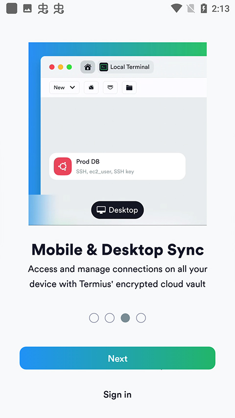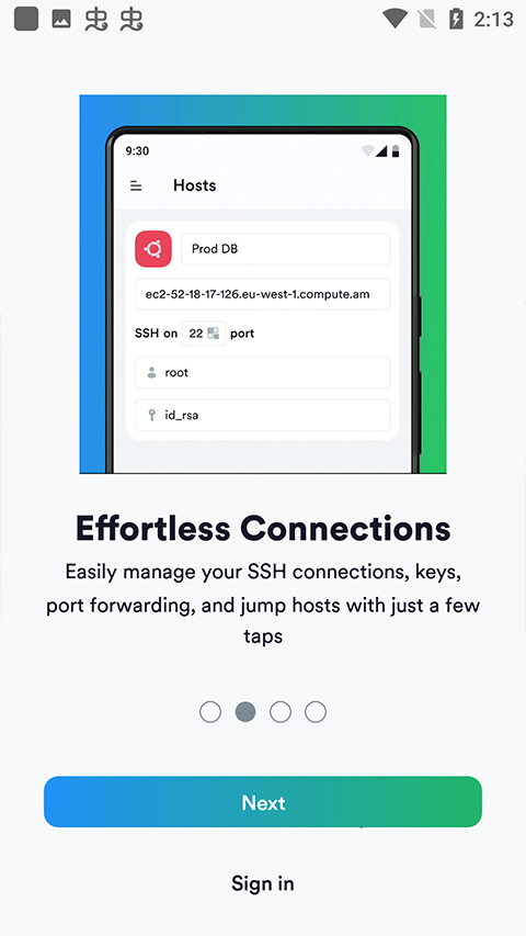 4.然后,回到Termius的首页,你就会看到刚才新建的连接啦!轻轻一点,就能开始连接服务器了。