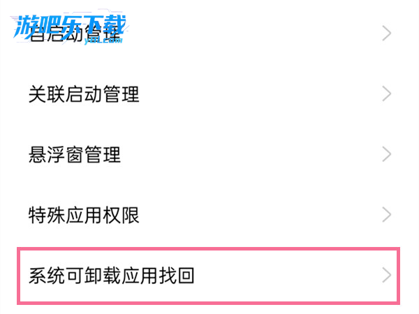 继续向下滑动,在页面底部找到系统可卸载应用找回(或 "找回系统应用")并进入