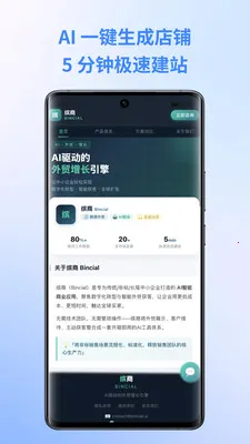 1. 缤商-语店官方正版下载具有一键极速开店的优势,上传资料即可自动生成店铺,快速上线获客,无需漫长等待。