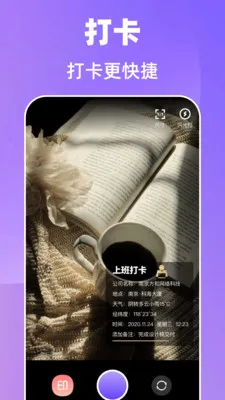 4. 水印打卡,记录精准:记录上下班时间,自动添加地点日期水印,防止作弊,确保考勤数据真实准确,且水印样式多样,展示个性。