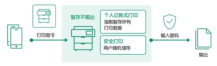 从移动设备进行打印时,打印数据将被暂存在多功能机上,用户在操作面板上输入密码后方可输出打印。由此可防止打印错误或将打印件遗漏在多功能机上,避免文档外泄风险。