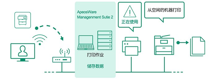 使用无服务器随心印功能时,即使用户选定的多功能机正在使用中,也可在其他多功能机上选择自己的作业并执行打印。支持从智能手机及平板电脑发送打印指令。