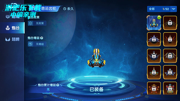 玩家点击左上方的三角形打开“更多”页面,选择炮台,即可进入炮台页面,可以查看炮台信息和切换。