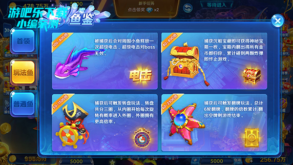玩家点击左上方的三角形打开“更多”页面,点击“鱼鉴”,即可查看鱼类的图鉴,了解捕鱼信息,让你更好的进行鱼类的捕捉,获取更多金币钻石。