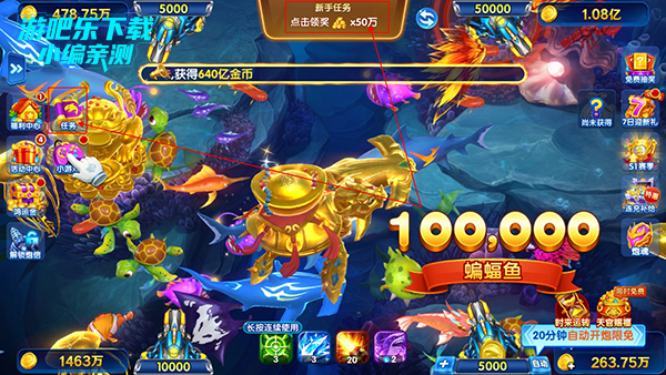 黄金捕鱼王是一款街机千炮联网捕鱼手游,深海爆金题材。主打黄金专属鱼种、高倍率炮台、全屏爆金,还原电玩城捕鱼玩法,多人联机对战。1 倍~888 倍自由调节,支持低倍稳刷、高倍爆发收割!