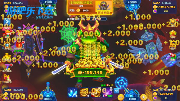 奖励:海量金币、黄金弹头、全屏炸弹、锁定冰冻次数、炮台材料