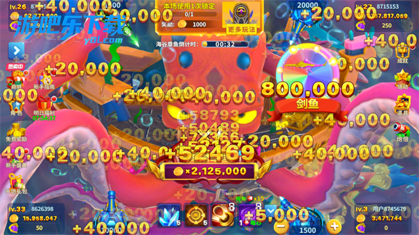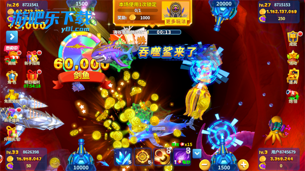 竞技排行赛场:捕鱼积分实时 PK,排名奖励大量金币、高级弹头、炮台皮肤。