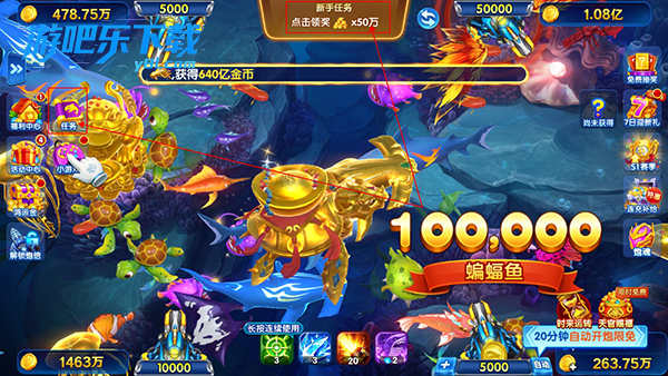 基础千炮起步,可解锁黄金炮、万王炮、高阶能量炮,炮台自带专属特效与捕获加成,炮弹具备反弹、穿透效果,一发可收割多只鱼群。