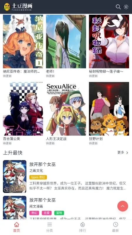 土豆漫画最新版是专为漫画爱好者打造的APP。连载更新同步及时,作品信息全,更新稳定。阅读流畅,资源海量,更新极速。操作简单,有下拉模式,能一键切换夜间护眼模式,方便找漫追漫,是追漫首选。