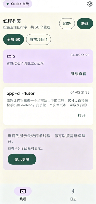 线程创建与管理 支持创建多个独立的 Codex 线程,并行处理不同的编程任务,可随时切换、暂停或终止线程