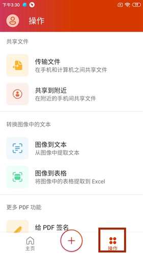 1、点击操作页面,涵盖传输文件、共享到附近等功能,还可转换图像文本与给PDF签名。