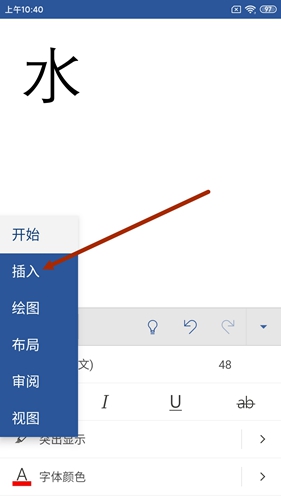 2、点击文字编辑场景,选中水字,下方菜单含开始、插入等编辑选项,方便文本处理。