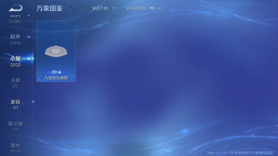 万象图鉴小屋页签包含主题、家具、展示墙、摆件4个页签。