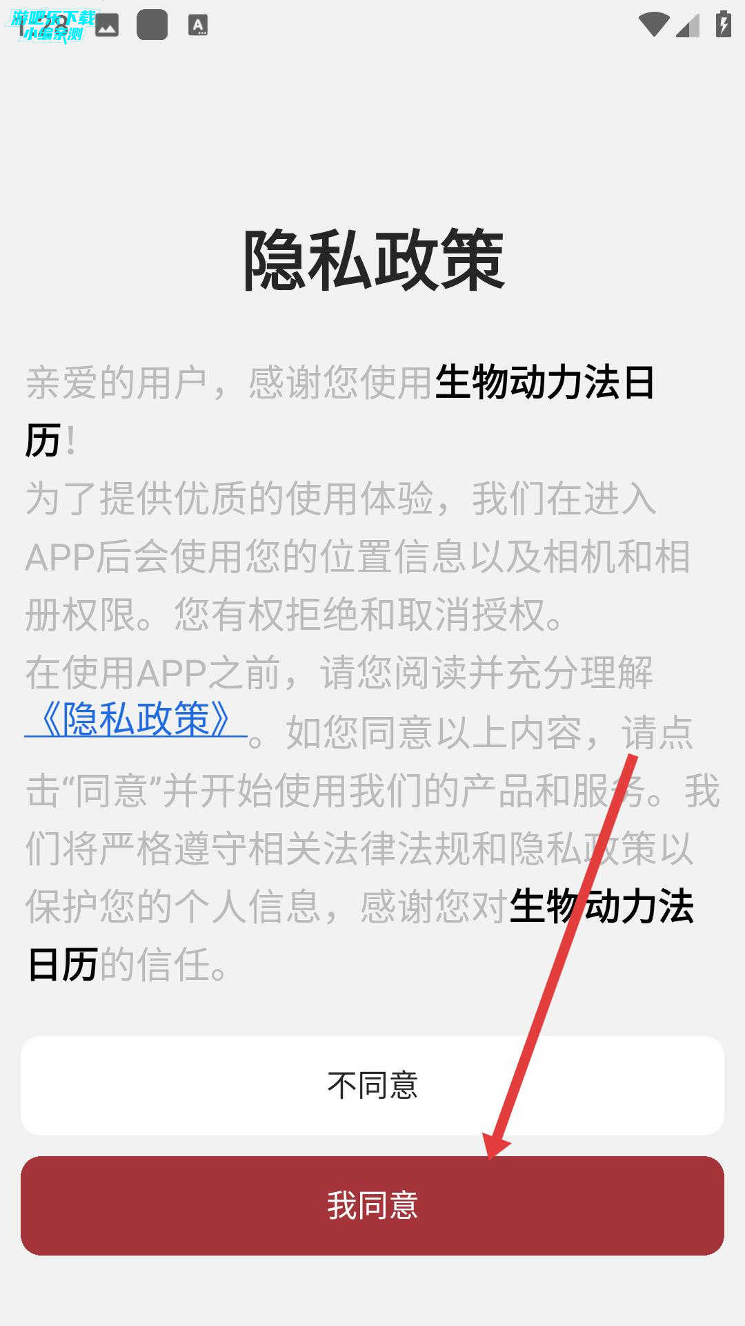 1、打开生物动力法日历APP,阅读隐私政策后点击我同意,进入应用,开启品酒相关功能探索。