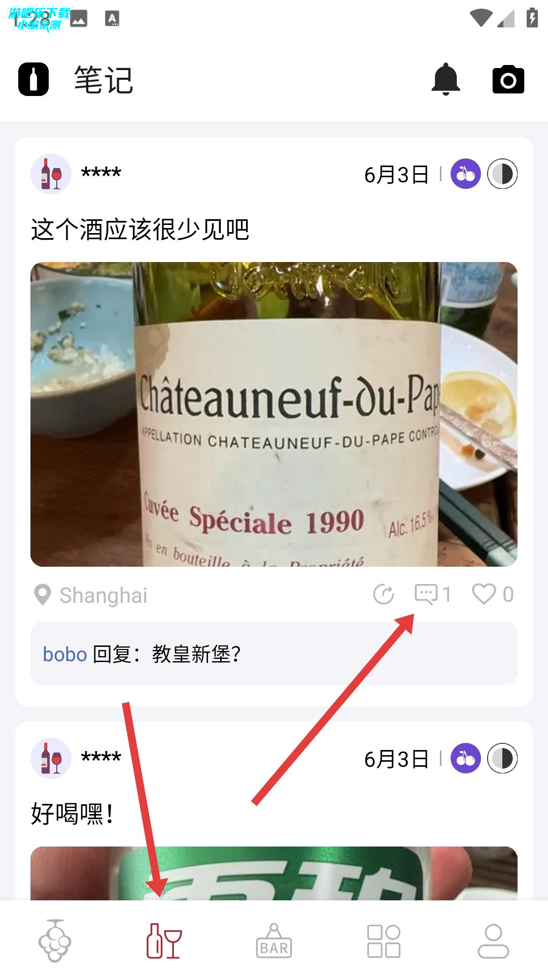 3、点击底部酒瓶图标,进入笔记页面,浏览他人品酒分享,还能对内容评论,交流品酒感受。