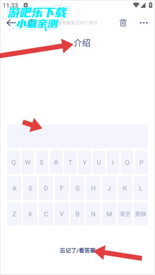 3、介绍提示内容,输入框待填答案,底部忘记了看答案按钮,界面简洁,聚焦答题场景,输入与提示功能配合,帮用户在练习中高效记忆单词。