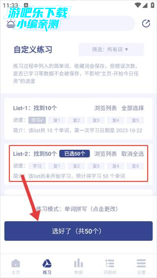 1、练习页自定义练习区清晰分类,需找50个单词,已选50个进度明确,练习模式单词拼写更改,选好了共50个按钮,推动用户开启针对性单词练习。