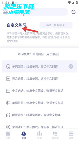2、自定义练习下,罗列单词回忆、英文选意等6种练习模式,单词回忆模式展开,用户可按需切换,丰富练习形式,助力灵活巩固单词知识。