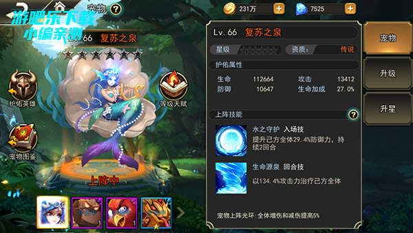 1、 复苏之泉,金色宠物,入场提升己方全体防御力,持续两回合;回合技是治疗己方全体。这个宠物非常适合无奶的阵容,为团队提供续航能力。