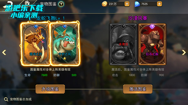 宠物可以通过宠物碎片合成,多余的宠物碎片则可以用于宠物升星,升星能大幅度提高宠物的属性。每个宠物都能护佑一位英雄,从而增加相关英雄的属性。而收集越多的宠物就能激活宠物图鉴,同样的,激活属性就能提高团队的整体属性。