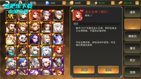 碎片也可以分解,换取英雄兑换券(在英雄商店用以购买其他英雄碎片、经验药水、晋升纹章、进阶石和突破石等物品)。