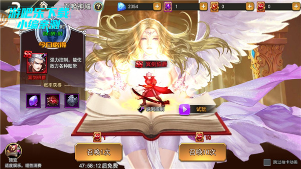 至尊召唤:玩家等级45级时开放,必得SS级英雄碎片(英雄种类会有周期变化),概率获得突破石、进阶石和迷宫币。同时,召唤页面提供当日必得碎片的英雄的试玩机会。
