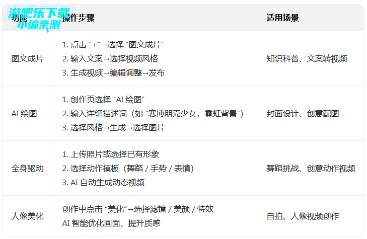 支持与热门角色、好友一键合拍,自带趣味剧本模板,轻松产出有梗、有互动感的短视频内容,降低社交创作门槛。搭载风格化转换、全身驱动、人像美化等丰富 AI 工具,简化视频与图片制作流程,让零基础用户也能快速产出高质量作品。提供真人形象优化与虚拟形象创建功能,支持用户通过持续创作沉淀个人风格,打造独特的数字身份与创作故事,契合 “主理人” 式自我表达趋势。