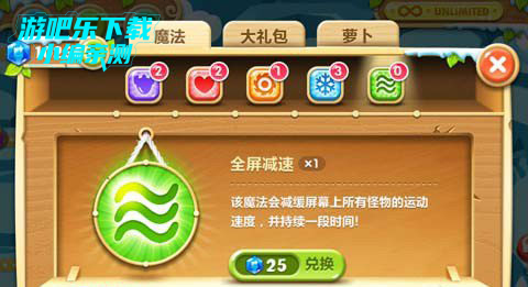 1、全屏减速:只要一个全屏减速就可以将全屏所有的怪物减速75%,并持续5秒!需要25宝石兑换1个。
