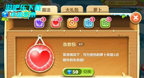 4、急救包:紧急情况下,可为受伤的萝卜恢复1点生命值!需要50宝石兑换1个。此魔法最好在萝卜九点血的时候使用,九点以下不要白费力气了,过关后重打吧。