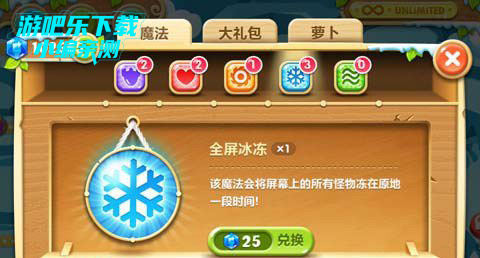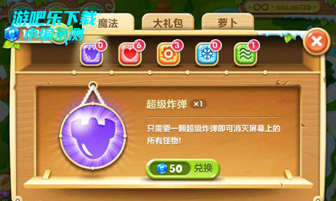 5、超级炸弹:只要1个超级炸弹就能消灭屏幕上除了铁皮怪之外的所有怪物!需要50宝石兑换1个。在怪物快吃掉萝卜的时候,或者boss(铁皮怪除外)快接近萝卜时血还很多的时候使用(快打死别乱用)在浮冰时每关的最后一波的boss(铁皮怪除外)特别好用。