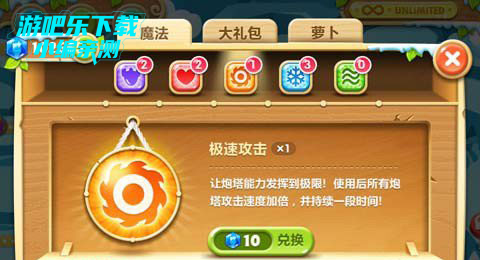 3、极限攻击:让炮塔能力发挥到极限!只要一个极限攻击就可以让全屏炮塔的攻击速度调到最快,并持续10秒!需要10宝石兑换1个。