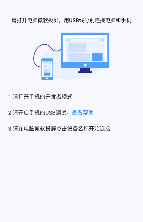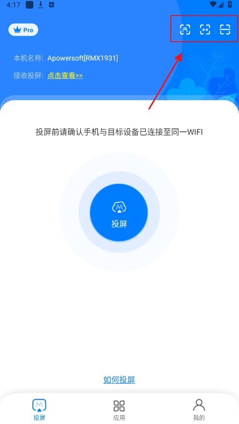 1、在首页找到右上角的几个按钮,分别对应USB连接、投屏码连接、扫码连接;